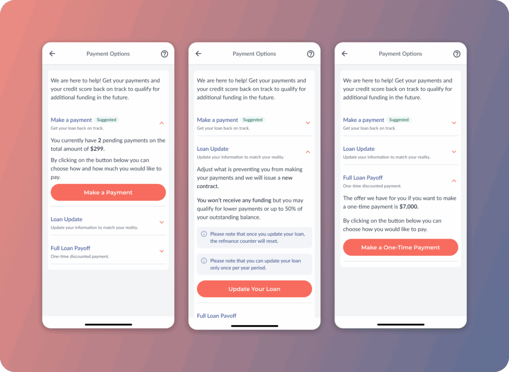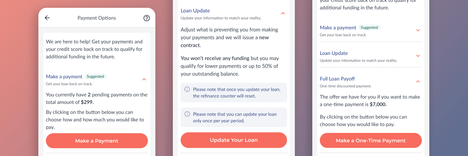 Although multiple resolution paths existed, the interface implicitly pushed customers toward a loan update or full payoff, assuming long-term financial distress, while not addressing customers with short-term financial hardships.